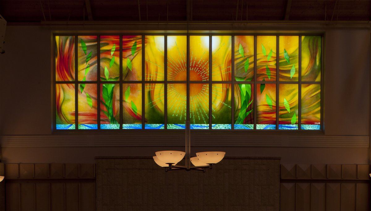 This project is a world first- a cathedral whose stained glass windows generate energy from sunlight, and provide a visible demonstration of stewardship. The design for "Lux Gloria" was inspired by the transcendent glory of God as seen in the beauty of creation and the vast prairie skies. Within the silver-hued array are 12 dichroic crosses, signifying the apostles.