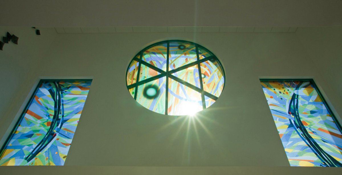 It was an absolute pleasure to work in collaboration with the team of artists at Peters Studio. This was my first time working in glass at such a large scale. The visit began with the Studio team confirming their understanding of my vision and concept for the project. After touring the various workshop spaces and gaining a succinct knowledge of the many options and processes available to me … I gained an expanded view of the possibilities and inventive potential of working with glass. I began fresh drawings to accommodate the new insights into glass as a very serious creative medium. I was confident we would realize the project beyond my initial thoughts. We began to play around with colors, techniques and materials. After a visit to a nearby church I decided to use aspects of antique glass in the fabrication process. At the Studio we selected a variety of antique glass "pieces" and experimented with layering the glass as a means to produce a more intimate experience in select areas, and also to introduce into the work a historic context for glass working in Germany.