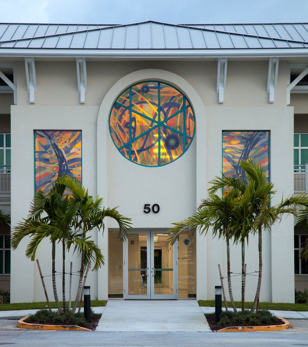 DESCRIPTION: The artwork’s title, "Wind Through Four Points", plays off of the points of a compass. Metaphorically, the wind rushes through the building, spreading through the lobby and all "four points" of its interior. The colorful first floor lobby with its 10 colors represents the sub-tropical visual flavor of South Florida: the constant cerulean blue sky, turquoise waters, bamboo leaf green, yellow and orange sun tones and sand. As juxtaposition, the second floor’s stark black and white represents an abstracted "street traffic" image. In addition, three art glass windows burst with color, light and movement. Fused glass pieces on the lobby’s side walls reference paper and other solid objects that have "blown" into the space.