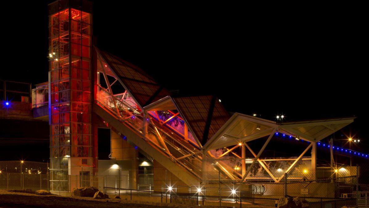 "Crystal Light" transforms the two-level environment of the Transfer Station of the UTA linking the new line to the airport. The dramatic weather of Salt Lake City is suggested in images of water in its different states: Ice crystals, clouds, a rushing stream, gentle waves of a lake are etched into the glass windscreens and elevator tower to catch the sunlight during the day, and at night color flows through the station with programmed lighting.