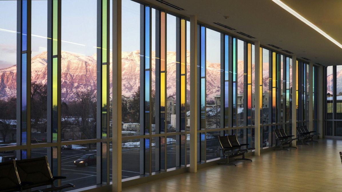 DESCRIPTION: Dichroic glass lines the mullions over the fourstory facade. "Sky Veil" transforms the courthouse environment for those who go there in a time of sorrow and stress. The glass curtain wall that slices through the volume of the building and creates beautiful lobbies outside each courtroom is the most dramatic element in the architecture of the courthouse. "Sky Veil" introduces color and interactivity with the surrounding landscape in these spaces so the surroundings are experienced through a new lens and the complexity of fragmented reflections challenges the mind to become alive to its environment.
