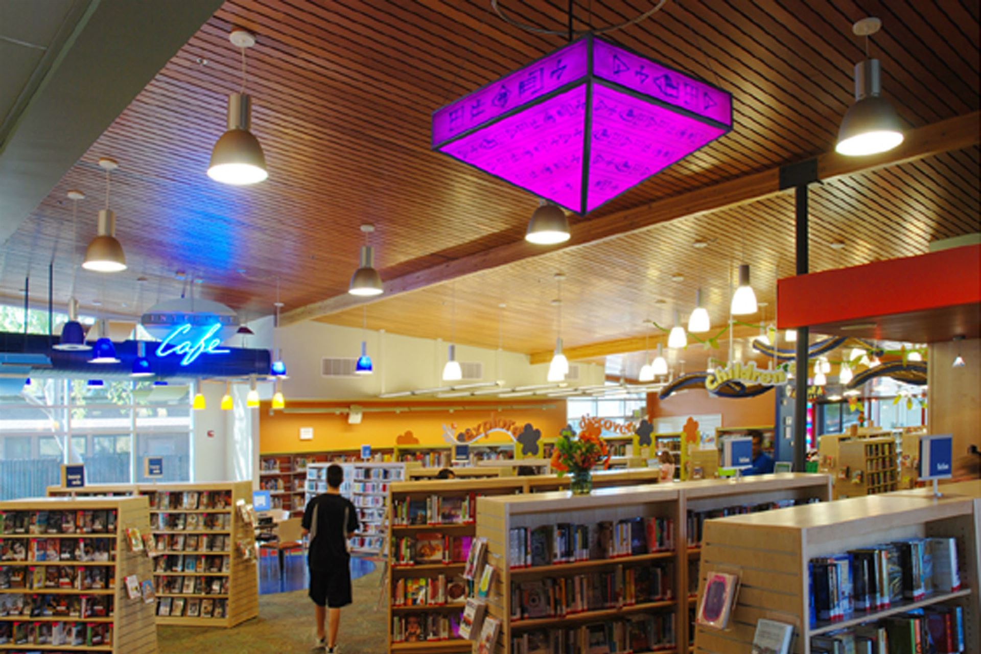 DESCRIPTION: Four Glass windows in the children’s section are embedded with photovoltaic cells that in turn power a suspended glass LED-illuminated lamp in the entry. The artwork’s imagery explores the evolution of alphabets as the foundation of the written word. Each window contains characters in scripts that are the basis for written Latin, Russian, Vietnamese and numerous Indian languages. "We are all one" is engraved repeatedly in cuneiform on the lamp. As this installation explores cultural differences in the windows, the color changing lamp bridges those distinctions by celebrating what we share.