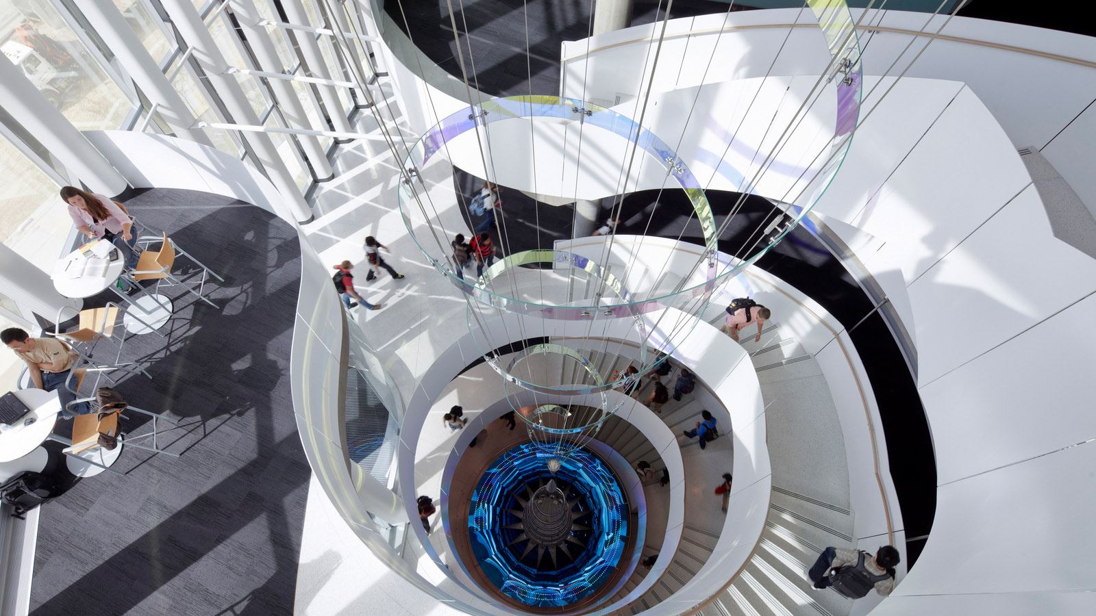 DESCRIPTION: Two cable-formed cones reach toward each other. This cone of cables supports a spiral made of vivid dichroic glass. The spiral unravels above the third floor, untangling into codependent strips of dichroic glass, which follows the curves of the stairway and atrium-floor openings.