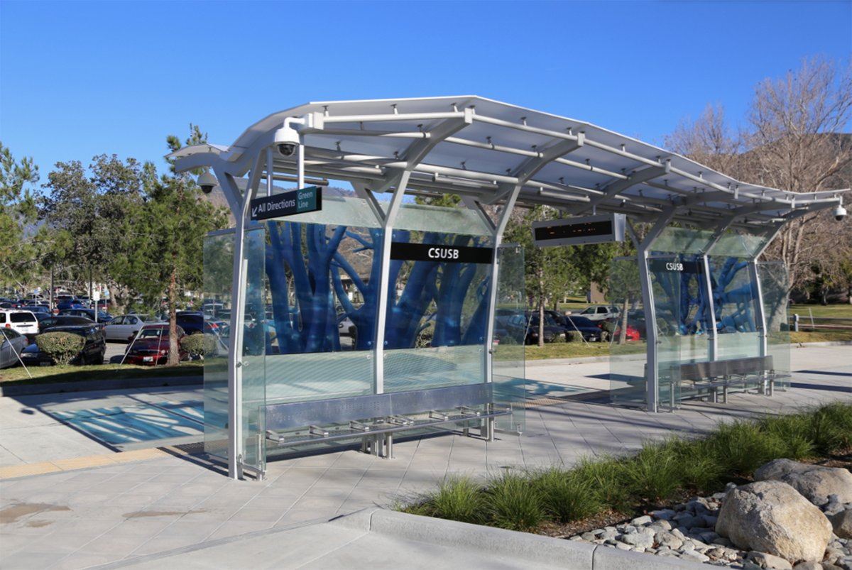 DESCRIPTION: The Blue Tree Project engaged the removal of a tree from the CSU San Bernardino campus. The loss of this pine tree was deemed necessary to develop a new station on the line of the more efficient sbX Rapid Transit system. Art students documented the tree removal process over the course of eight weeks. Photographs of the tree are printed into glass windshield panels – an archive of the process of a tree being cut, pruned, painted blue and photographed for public art. On overcast or smoggy days, the same blue images of the tree will come to the visual forefront as the panel and white background frame them. As the sun passes through the glass, images of the tree are cast onto the ground, symbolizing the loss of the tree.