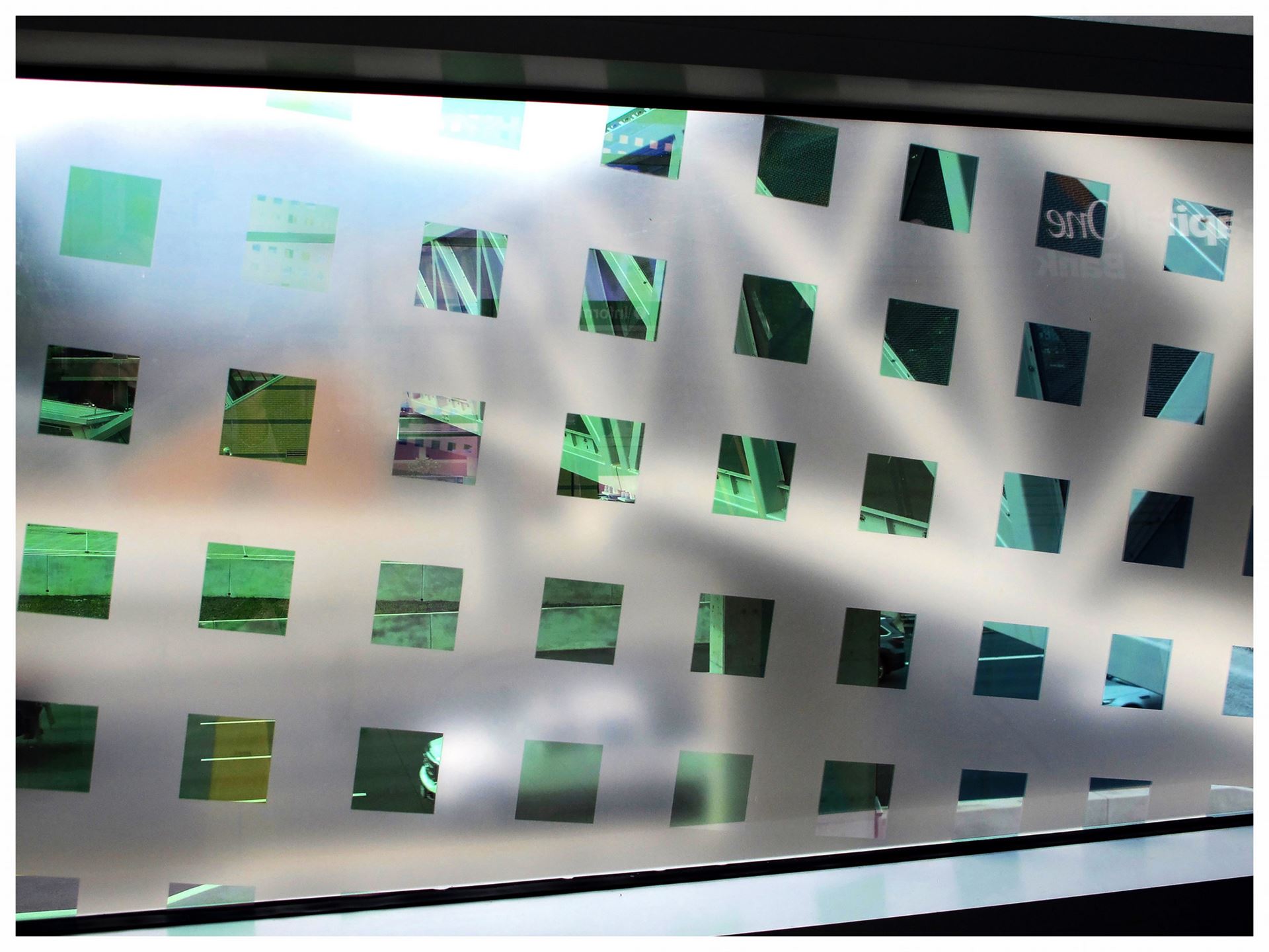 The artwork at Wiehle-Reston East was designed to catch the attention of those traveling through the space. As the bridge makes use of a sloped „shed“ roof, the artwork reflects this dynamic. The refinement and simplification of the design process utilized the diagonals as the essential motif linking the negative space of the passenger bridge walkways.