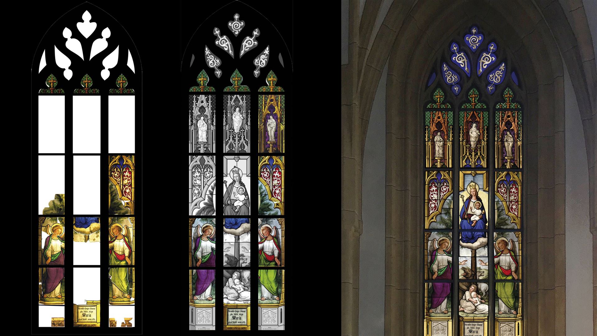 Die zusammengetragenen Archivunterlagen und die parallel laufende Suche nach den noch fehlenden Fensterfragmenten machten als ersten Schritt eine Rekonstruktionszeichnung der fehlenden Elemente möglich. Die in Teilen des Fensters vorherrschende Achsensymmetrie erleichterte die Rekonstruktion und verschaffte Sicherheit für die Schließung der Fehlstellen.